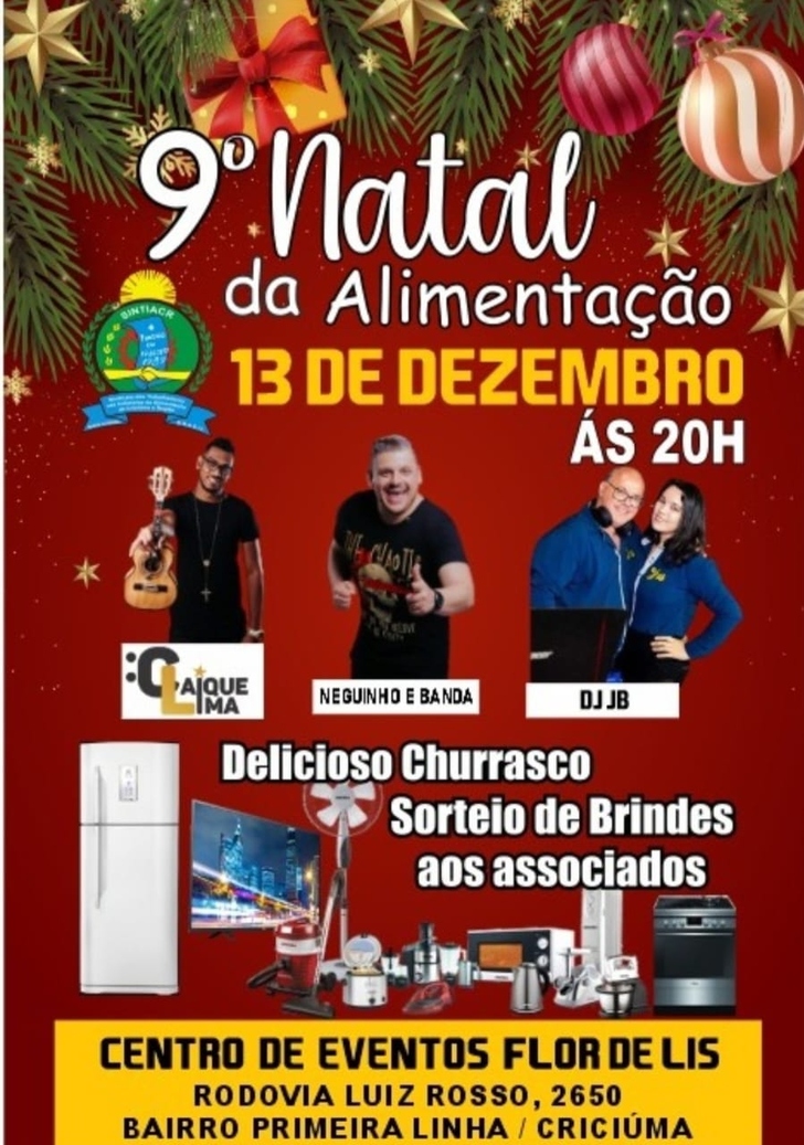 O 9º Natal da Alimentação, a tradicional festa da categoria, este ano será dia13 de dezembro, às 20h, no Centro de Eventos Flor de Lis em Criciúma.